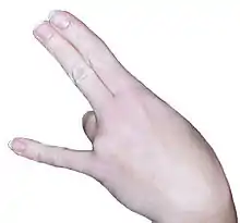 The shocker is a hand gesture with a sexual connotation.[1] The index, middle, and little fingers are extended, while the ring finger is curled or bent down. The index and middle fingers are held together. The thumb may be tucked against the palm or – in a variation on the gesture – extended.[2]