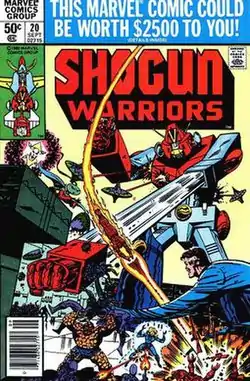 ![]() Combatra of Shogun Warriors fighting alongside the Fantastic Four on the cover of Shogun Warriors #20 (September 1980) published by Marvel Comics. Cover art by Herb Trimpe. | |