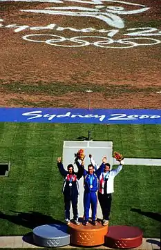 Women's 10 metre air rifle: Nancy Johnson (center), Kang Cho-hyun (left), and Gao Jing (right) won the first medals of the 2000 Olympic Games.