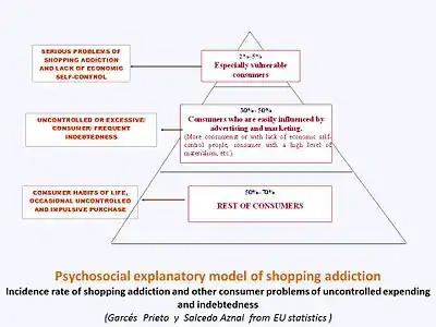 Psychosocial approach : Since the 1980s a significant increase in the number of people with important problems of lack of control in shopping and spending has been established. Given the fact that this increase was parallel with the spreading of the values and behaviour of the consumer society, these disorders started to be considered as an individual manifestation of a general social problem. A model taking this approach was one by Javier Garcés and Alejandro Saucedo,[23] who regard shopping addiction as "the tip of the iceberg” that is, the most intense manifestation of a general problem which affects, to a greater or lesser extent, a great deal of the population.[24] The behaviour differences between the average consumer and the shopping addict are more quantitative than qualitative. Advertising and commercial influences, which cause in some people serious problems of shopping addiction or excessive indebtedness, also contribute to excessive consumer behaviour in many others. This model is graphically described by the “consumerist pyramid”. Another model is the one defended by Helga Ditmar, which could be classified as a mixed model, since she considers that shopping addiction problems are caused by the conjunction of two factors: a high level of materialism and a high discrepancy between the real self-concept (how the person sees themselves) and the ideal self-concept (how the person wishes to see themselves).[25]