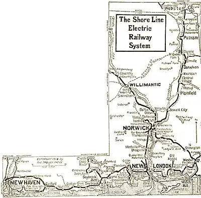 Finally, the company acquired the Connecticut Company's New London division, which was disconnected from the other Connecticut Company lines. The New London division included rural main lines from New London through Norwich to North Grosvenordale (with a connection to Worcester via the Worcester Consolidated Street Railway) and from Norwich to Coventry via Willimantic; local lines in New London including a line to Ocean Beach; local lines in Norwich including a line to Yantic; and branches from Elmville to East Killingly (with a connection to Providence via the Rhode Island Company's Providence and Danielson Street Railway) and from Central Village to Moosup.[2][3] This gave the Shore Line control over a network of almost 300 miles of lines, representing a monopoly on trolley service in the eastern part of the state.[2]