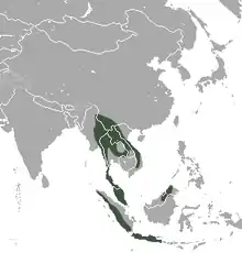 The species lives mainly in Southeast Asia (Brunei, Cambodia, Indonesia, Laos, Malaysia, Myanmar, Thailand and Vietnam), but it is also found in China.[4]