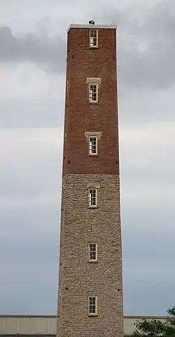 The Shot Tower located in Dubuque, Iowa, is one of the last remaining shot towers in the United States. It is listed on the National Register of Historic Places and remains a recognized symbol of the city. At its location near the Mississippi River, the Tower can be seen from the riverwalk and is currently undergoing extensive renovations. It stands 120 feet 5 inches (36.70 m) tall.
