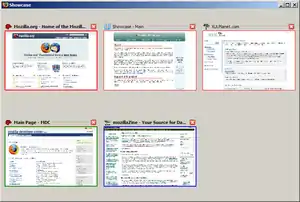 Showcase is an extension for the Mozilla Firefox, Flock, and SeaMonkey (as a special port named "Seamonkey Showcase") web browsers. Its function is to show all open browsers as thumbnails, and it offers capabilities like search and tab organization.