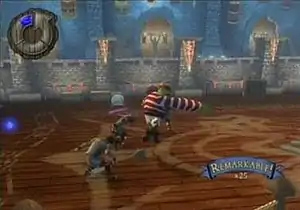 There are numerous boxes, barrels, and other smashables scattered around the levels. Most contain fairy dust for use in special attacks, but a few contain coins and food. Coins are of either gold or red colors (called Far Far Pounds). In addition to the aforementioned smashables, a source of Far Far Pounds can often be just finding them scattered around, as well as under certain circumstances, enemies. Gold coins are worth 3 pounds and red coins are worth 10 pounds. The player has to fight with fists and swords against multiple enemies, like pirates, guards, athletes, evil trees, and witches, depending on the level the player is in. After an enemy has sustained several hits, a finishing move can be used on them, which, when activated, plays an animation of the currently selected character finishing off the enemy, defeating them instantly, as well as causing them to drop special purple fairy dust. Felled enemies will drop fairy dust that will fill up the three-part special attack meter.
