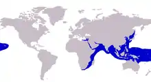 The shrimp scad is distributed throughout the Indo-Pacific region from South Africa in the west, along the coasts of East Africa, India, Asia, Indonesia, northern Australia, Japan[8] and extending as far east as Hawaii.[5] They are also one of the species involved in the Lessepsian migration through the Suez Canal and inhabit the east coast of the Mediterranean Sea around Israel, Lebanon and Egypt[9] and Sea of Marmara[10] The species is primarily an inshore inhabitant of reefs and over open sand patches, even in moderately turbid waters,[11] often forming large schools. The species has in isolated circumstances also been found close to shore in surf zones in Japan[12] and in estuarine waters in South Africa.[13] The species is occasionally found in offshore environments, suggesting it can lead a pelagic lifestyle also.[14]