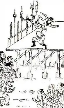The Manchu rulers of the Qing dynasty enjoyed wrestling. In the Qing dynasty, wrestling was referred to as liaojiao, guanjiao, buku and jueli/jiaoli.[5] The Kangxi Emperor was reported to have established the Shanpuying (Manchu: buku kifu kvwaran).[6] This was an institution dedicated to training wrestlers. The camp was located in Beijing and counted 300 members, of which 50 were archers, 50 were riders and the remaining 200 were wrestlers.[7] The camp was split into two wings, left and right, based on which way the direction the camps are located from the perspective of the Imperial Palace. Each of the wings was headed by a different wing commander, both of whom answered to the same Zongtong Dachen 總統大臣 (President). The likely purpose of this split of the camp, Yuhuan writes, was to stimulate rivalry between the two sides so that the wrestlers would always remain competitive.[8] Its members, also called Puhu (or Buku in Manchu) were expected to perform a variety of duties such as guarding the Emperor and wrestling with Central-Asian tribute bearers.[9]