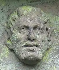 Inside the portico is a rusticated arch, which frames a relief fashioned by the Flemish sculptor Peter Scheemakers.[6] The relief is a copy of the Poussin painting Et in arcadia ego and shows a woman and three men, two of whom are pointing to a tomb. On the tomb is carved the Latin text Et in arcadia ego ("I am also in Arcadia" or "I am, even in Arcadia").[7] The carving displays a number of small alterations from the original painting, including the addition of an extra sarcophagus placed on top of the main tomb. Below the relief is a stone plaque displaying a ten-letter inscription. The inscription is broken into two lines. There are eight letters on the first line, and two below on the second line, placed at either end of the letters on the first line. The letters on the second line, D M, were commonly used on Roman tombs to stand for Dis Manibus, meaning "dedicated to the shades".