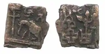Later Shunga emperors were seen as amenable to Buddhism and as having contributed to the building of the stupa at Bharhut.[14] During his reign the buddhist monuments of Bharhut and Sanchi were renovated and further improved. There is enough evidence to show that Pushyamitra patronised buddhist art.[15] However, given the rather decentralised and fragmentary nature of the Shunga state, with many cities actually issuing their own coinage, as well as the relative dislike of the Shungas for the Buddhist religion, some authors argue that the constructions of that period in Sanchi for example cannot really be called "Shunga". They were not the result of royal sponsorship, in contrast with what happened during the Mauryas, and most of the dedications at Sanchi were private or collective, rather than the result of royal patronage.[16]