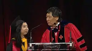 After the speech, university president Wallace Loh, a native of Shanghai, returned to the lectern on the verge of tears and commented, "[the speech] was most inspiring. And like you and your parents, I also am an American by choice, and you have expressed some of the deepest feelings I feel for this country."[3]