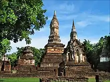 Wat Phra Si Ratana Mahathat or Wat Si Mahathat Chaliang (Thai: วัดพระศรีรัตนมหาธาตุ หรือ วัดศรีมหาธาตุเชลียง) is the biggest and the most important historic temple in Si Satchanalai - Chaliang. The temple was built as a Mahayana Buddhist temple in the late 12th century during the reign of Jayavarman VII when Chaliang was part of his Khmer Empire. The main structure is the impressive prang, in a Thai-adopted Khmer style gopura. The original design of the prang is believed to be Bayon styled, but when Chaliang was under the Ayutthaya Kingdom, the prang was redesigned to the current form of Ayutthayan style by Borommakot in the 18th century. The temple compound is surrounded by thick high laterite wall. The vihara has a big Buddha image, framed with high laterite columns. The temple gate was decorated with unique Brahma head in four directions and Apsara bas-reliefs. On the left side of the prang is a Sukhothai styled walking Buddha image. Behind the prang has well-preserved mandapa, a standing Buddha image and the ruin of Mon-styled stupa as well as many smaller Sri Lanka-styled stupas. The importance of the temple during Sukhothai Kingdom was recorded in the Ramkhamhaeng stele, and many historical records during Ayutthaya, Thonburi and Rattanakosin Kingdom. In 1958 after Bhumibol and Sirikit visited the temple, Wat Phra Si Ratana Mahataht was promoted as the first rank Ratchawarawihan or royal temple and put under the patronage of the Thai royal family.
