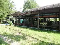 In 1966 four identical locomotives of type DS40/1 were delivered from the German Diepholzer Maschinenfabrik Fritz Schöttler (Diema) with the serial numbers from 2886 to 2889 to Union Development Co. Ltd., Bangkok. Overall Diema built 25 locomotives of this type.[1] These four engines were overtaken by the park railway, numbered as 1 to 4 - not following the order of the serial numbers. After its closure they were still dumped until today at the former, roofed storage sidings. Diema delivered a total of just six locomotives to Thailand, all of them are preserved so far, besides this four mentioned engines two other locomotives still exist at a sugar factory in Ko Kha as a monument.[2] A railway unit consisted of five covered coaches with two axles. In the 1990s they were replaced by a newer construction once more - labeled with "Siam Park Transportation Company".