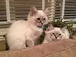 Male Blue lynx point (left) and Female Seal lynx point (right) Siberian colorpoint kittens at 13 weeks old