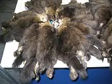 In addition to sable, black and white fox, ermine, beaver, squirrel, lynx, wolf, wolverine, rabbit, marten, walrus, sea otter, and polar bear were also hunted for their pelts.[6] Most of these fur bearing animals are found in the Siberian taiga, except for the sea otters and walrus that were found on the North Pacific coasts.[16] In more recent times, fur farming has been used to breed animals for their fur. Silver fox farms were started in 1936, mostly in Yakutia.[6] These farms eliminated some of the dangers and uncertainties involved with hunting in the wilderness.