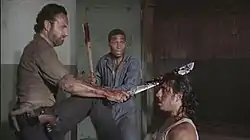![]() Rick kills the leader of the prisoners, Tomas, who tries to assassinate him. | |