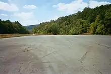 The Sideling Hill Tunnel's original plans date back to the year 1881, when surveying for the South Pennsylvania Railroad began. Construction began that year, with the plans for nine brand-new tunnels, most of which were drilled by 1885.[2][3][4] The Sideling Hill Tunnel was built before December 1884 by John O'Brien, an engineer from Rhinebeck, New York.[5] On July 6, 1885, a blast occurred at the end of the Sideling Hill Tunnel. The blast, which was caused by dynamite, claimed the lives of three people, including O'Brien. Several other people were injured in the blast.[6] Just sixteen days later, another blast occurred in the tunnel, taking the lives of a Hungarian worker, along with two African-Americans, two Italians, and one Irishman. The bodies were so cut by the rocks during the blast, that the people were almost unidentifiable.[7] Unfortunately William H. Vanderbilt, who had started the plans for the railroad, noticed that expenses began to inflate, and he began to look for a second way to work things out. The construction was abandoned and never finished. In 1938, the Pennsylvania Turnpike Commission took over the entire grade of the abandoned railway.[2][3][4]