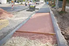 Contemporary sidewalks are most often made of concrete in North America, while tarmac, asphalt, brick, stone, slab and (increasingly) rubber are more common in Europe.[28] Different materials are more or less friendly environmentally: pumice-based trass, for example, when used as an extender is less energy-intensive than Portland cement concrete or petroleum-based materials such as asphalt or tar-penetration macadam. Multi-use paths alongside roads are sometimes made of materials that are softer than concrete, such as asphalt.