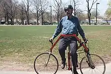 The sideways bike is different in many ways from a conventional diamond-framed bicycle. The rider controls direction by steering with both front and back handlebars.[3] This means that the bicycle can maneuver effectively in congested conditions, weaving in and out of cars and performing tight turns. It also means that the rider can move the bike sideways, as the name suggests, such that the movement is perpendicular to the direction in which the frame points. Although this is possible, it is very difficult, as it is necessary for the rider to have extremely good balance and coordination.