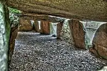 The entrance is located in the centre of the southeastern side,[2] its support stones are original whilst the capstone has been restored.