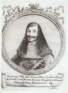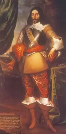 After the death of John IV of Portugal in 1656, various Spanish offensives were launched against Portuguese territory, mainly from Extremadura, but also from Galicia, where a second front was opened to force the Portuguese to divide their forces.[6] The Spanish Army of Extremadura, recently reinforced with many veterans of the war against France, was commanded by Francisco de Tuttavilla, Duke of San German, who appointed Gaspar Téllez-Girón y Sandoval, Duke of Osuna, as general of artillery and his second-in-command.[7] In 1657 they laid siege to the Portuguese town of Olivença with 8,000 soldiers and 29 cannons and occupied the town, despite a desperate attempt by the Count of San Lorenzo, military governor of Alentejo, to dislodge them by launching a surprise attack himself on the Spanish town of Badajoz. Mourão fell into Spanish hands shortly thereafter.[7] San Lorenzo was then dismissed from his command and replaced by dom Joanne Mendes de Vasconcelos, who easily managed to retake both Mourão and Olivença in the following months, since their Spanish garrisons had been considerably diminished in order to move troops to face the French armies in Catalonia.[8]