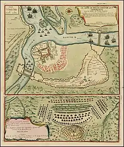 On 14 May Eugene left Vienna sailing down the Danube to Buda. On 15 May he inspected the fortifications for a few hours then left for Futak near Petrovaradin where he arrived on 21 May to meet the bulk of his troops.[12] Before the troops were assembled, Prince Eugene began his march southwestwards towards Belgrade with about 70,000 men. These were reinforced by 5,700 Bavarians, Austrian troops stationed in the Banat, and volunteers from half the royal houses of Europe, including a company of Frenchmen led by the grandson of the late Louis XIV (both Count of Charolais and Prince of Dombes took part in the siege), for a total of about 100,000 men. In addition, Eugene commanded the Danube flotilla, consisting of about fifty boats of various types and ten naval vessels armed with light artillery. Eugene wanted to reach the city and begin the siege as soon as possible before any Ottoman troops could reinforce the city. The biggest problem was that the fortress could not be attacked from the south, and progress could only be made after crossing the Danube and the Sava. He chose the direct route, by crossing the Sava river, although, on this side, the fortress offered its strongest side. On 15 June the Imperial troops reached Pančevo, to the east of Belgrade.[13]