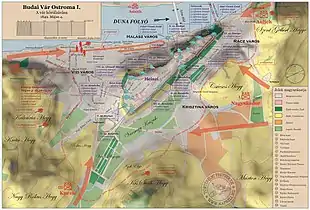 The heights of the walls surrounding the castle were not uniform. They were punctuated by old circular bastions, called rondellas, and newer, polygonal bastions, close enough together to enable them to bring fire to bear on the enemy attacking the walls between them.[22] The fact that there were no moats, beneath the walls, and that the hill was surrounded by houses and gardens except near the four castle gates, made the besiegers' job easier.[22] The castle's defenses were of 16th century standard, because fortification modernization of later periods had almost no effect on this castle without exterior walls and defenses and consisting only of a "core fort".[22] The most important defenses of the castle were its walls surrounding the edges of the Castle Hill. This wall was built in different periods and was repaired in various ways in the 163 years between the sieges of 1686 and 1849. Because of this, it was of different widths, without embrasures, protective structures, etc., and lacking the most basic elements of modern siege technology.[22] The gates were mostly vestiges of the past rather than real castle gates, lacking trenches or drawbridges.[22] Comparing it with Hungarian castles such as Arad, Temesvár, Komárom, Gyulafehérvár, Pétervárad or Eszék, it can be said that it was centuries behind these; and because of this the intention to defend it came as a surprise to many. But the imperials understood the importance of holding the Castle of Buda as long as they could, both for political and symbolic reasons as well because of having accumulated a large store of military equipment there; and they did not want to give all of these up so easily.[22]