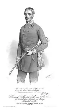 Following the imperial campaign against Hungary that began in mid-December 1848 and was led by Field Marshal Alfred I, Prince of Windisch-Grätz, the ensuing retreat of the Hungarian armies, and the Hungarian defeat at the Battle of Mór, the Habsburg troops entered the Hungarian capitals on 5 January 1849.[12] The free Hungarian parliament, the National Defense Committee (interim government of Hungary), and a long convoy of civilians with all their possessions fled through the cold and snowy winter east to the Tisza River, installing the interim capital at Debrecen.[13] The first thing Windisch-Grätz ordered after entering Buda was the occupation of the castle and the Gellért Hill.[12] Windisch-Grätz named Lieutenant General Ladislas Wrbna as the commander of the Buda Military District, the military commander of the imperial troops in the capitals. But at the end of February, when the commander-in-chief prepared to attack the Hungarian army, he took Wrbna with him on the campaign, leaving Major General Heinrich Hentzi, commander of the imperial garrison of the Castle of Buda, to take overall command of the troops in Buda and Pest.[14]