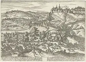 Despite the promises of Prince Maurice of Orange to relieve Huy, the forces of the new Governor-General of the Spanish Netherlands, Don Pedro Henríquez de Acevedo, Count of Fuentes (Spanish: Conde de Fuentes), led by Don Valentín Pardieu de la Motte, after a short siege and low resistance, captured the town and the citadel from the combined Protestant troops of Charles de Héraugière.[1][2] Thirteen days later, on March 20, Héraugière, unable to keep the defense, agreed to terms of capitulation between the Protestant forces and the Spaniards.[4]