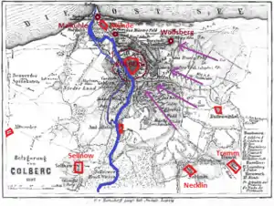 The remaining forces, except for the grenadiers, were entrusted with the defense of other sconces in the vicinity of Kolberg.[37] The headquarters of the siege force was in Tramm (now Stramnica), where the grenadiers were concentrated.[37] The artillery, under command of general Mossel, was concentrated near Zernin (now Czernin), and defended by a Saxon detachment stationed in Degow (now Dygowo).[37] The construction of the siege works, was since 5 May supervised by brigade general Chambarlhiac of the 8th corps on Napoleon's behalf.[41]