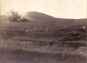On September 18, Japanese General Kodama visited General Nogi for the first time, and drew his attention to the strategic importance of 203 Meter Hill.[4] Nogi directed the first infantry assault against the hill on September 20,[2] but found its fortifications impenetrable to Japanese artillery and was forced to retreat by September 22 with over 2500 casualties.[4] He then resumed his attempts to break through the fortifications at Port Arthur in other locations, cumulating in a six-day general assault at the end of October, which cost the Japanese a further 124 officers and 3611 men.[4] News of this defeat inflamed Japanese popular opinion against Nogi. General Yamagata urged his court-martial, but Nogi was saved from this only through the unprecedented personal intervention of Emperor Meiji. However, Field Marshal Oyama Iwao found the continuing unavailability of the 3rd Army's manpower to be intolerable, and sent General Kodama Gentarō to compel Nogi to take drastic action, or else relieve him of command. Kodama returned to visit Nogi again in mid-November, but decided to give him one last chance.[5] After arduous sapping work and an artillery assault with the new Armstrong 11-inch siege guns, mines were exploded underneath some of the Russian fortifications on the main defense perimeter from November 17–24, with a general assault planned for the night of November 26. Coincidentally, this was the same day that the Russian Baltic Fleet was entering the Indian Ocean. The assault contained a forlorn hope attack by 2600 men (including 1200 from the newly arrived IJA 7th Division) led by General Nakamura Satoru,[5] but the attack failed, with direct frontal assaults on both Fort Erhlung and Fort Sungshu once again beaten back by the Russian defenders. Japanese casualties were officially 4,000 men, but unofficially perhaps twice as high.[4] Russian General Roman Kondratenko took the precaution of stationing snipers to shoot any of his front line troops attempting to abandon their positions. At 08:30 on November 28, with massive artillery support, Japanese troops again attempted an assault up the sides of both Akasakayama and 203 Meter Hill. Over a thousand 500 lb (230 kg) shells from the 11-inch (280 mm) howitzers were fired in a single day to support this attack. The Japanese reached as far as the Russian line of barbed wire entanglements by daybreak and held their ground throughout the following day, November 29, while their artillery kept the defenders busy by a continuous bombardment. Nonetheless, the Japanese forces suffered serious losses, as the Russian defenders were well positioned to use hand grenades and machine guns against the tightly packed mass of Japanese soldiers. On November 30, a small party of Japanese succeeded in planting the Japanese flag at the summit of the hill, but by the morning of December 1, the Russians had successfully counterattacked. Still retaining the authority to replace Nogi if necessary, Kodama assumed temporary command of the Japanese front-line forces, but officially maintained the despondent Nogi in nominal command.[4]
