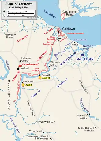 The Battle of Yorktown or Siege of Yorktown was fought from April 5 to May 4, 1862, as part of the Peninsula Campaign of the American Civil War. Marching from Fort Monroe, Union Maj. Gen. George B. McClellan's Army of the Potomac encountered Maj. Gen. John B. Magruder's small Confederate force at Yorktown behind the Warwick Line. McClellan suspended his march up the Peninsula toward Richmond and settled in for siege operations.