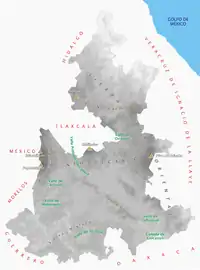 The area is at the intersection of the Sierra Madre Oriental and the Trans-Mexican Volcanic Belt.[2][3] These mountains extend eastward into the state of Veracruz until the narrow Gulf of Mexico coastal plain.[4] The areas rocks is mostly sedimentary with some volcanic, but all have been altered by tectonic processes caused by the moving earth and forming the mountains here.[5] The area is very rugged with few narrow valleys with about 60% of the territory made up of steep slopes. Altitudes range from 100 to 2,300 meters above sea level. The area is filled with caves and caverns, many of which are little explored.[3][4] The area's mountains are divided into the Sierra de Zacapoaxtla, Sierra de Huauchinango, Sierra Teziutlán, Sierra de Tetela de Ocampo, Sierra de Chignahuapan and Sierra de Zacatlán. The highest altitudes are over 4,200 meters above sea level. Main elevations include Apulco, Chichat, Chignahuapan, Soltepec and Tlatlauquitepec.[2]