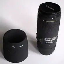 This lens come with a 90 mm long cylindrical lens hood attaches with a bayonet mount on the front of the barrel. It can be reversed over the barrel for storage or carrying. You can also fit the lens cap when the hood is in either position.