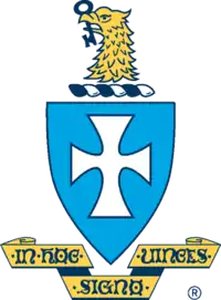 The crest of Sigma Chi is a blue Norman Shield with a white cross in its center. On top of the Norman Shield is a scroll and a crest of an eagle's head holding a key. Below it, the fraternity's public motto, "In Hoc Signo Vinces" is placed on a scroll. It can be translated as, "In this sign, you will conquer."[34]