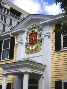 It is in feeling wildly Baroque (of all things)—a welcome touch of flamboyance for what would otherwise have been a rather staid clubhouse for the Signet… the graphic quality of Cram & Goodhue’s and LaRose’s new frontispiece is actually rather reminiscent of book design (not to mention the Palladianism of several Tory Row mansions), and centers on a two story pedimented Ionic pavilion displaying the Signet arms…. The design concept- cavalier enough, but very successful—discloses another guise of history-making in Harvard architecture: to restore the house, not as it originally was, but in LaRose’s words, as it "ought to have been." Thus the architectural solecism of the two orders of the porch—the Doric columns and Ionic pilasters—was retained.[2]