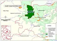 Silent Valley National Park is a national park in Kerala, India. It is located in the Nilgiri hills, has a core area of 89.52 km2 (34.56 sq mi), which is surrounded by a buffer zone of 148 km2 (57 sq mi). This national park has some rare species of flora and fauna. This area was explored in 1847 by the botanist Robert Wight.[2] It is located in the border of Mannarkkad Taluk of Palakkad district, Nilambur Taluk of Malappuram district, Kerala, and Nilgiris district of Tamil Nadu.