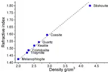 Alpha quartz is the stable form of solid SiO2 at room temperature. The high-temperature minerals, cristobalite and tridymite, have both lower densities and indices of refraction than quartz. The transformation from α-quartz to beta-quartz takes place abruptly at 573 °C. Since the transformation is accompanied by a significant change in volume, it can easily induce fracturing of ceramics or rocks passing through this temperature limit.[9] The high-pressure minerals, seifertite, stishovite, and coesite, though, have higher densities and indices of refraction than quartz.[10] Stishovite has a rutile-like structure where silicon is 6-coordinate. The density of stishovite is 4.287 g/cm3, which compares to α-quartz, the densest of the low-pressure forms, which has a density of 2.648 g/cm3.[11] The difference in density can be ascribed to the increase in coordination as the six shortest Si-O bond lengths in stishovite (four Si-O bond lengths of 176 pm and two others of 181 pm) are greater than the Si-O bond length (161 pm) in α-quartz.[12] The change in the coordination increases the ionicity of the Si-O bond.[13] More importantly, any deviations from these standard parameters constitute microstructural differences or variations, which represent an approach to an amorphous, vitreous, or glassy solid.