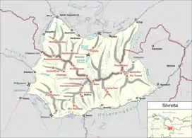 The Silvretta Alps are surrounded by the Rätikon, Verwall, Samnaun, Sesvenna, Albula and Plessur ranges.
