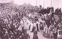 The relics of Simeon draw many pilgrims to the monastery; in the early 20th century the number of visitors reached 60,000 people in a year.[9] Incidentally, the Exaltation Cathedral was built in the Nikolayevsky Monastery in 1913 to hold eight to ten thousand people. The dedication and the translation of the relics of Simeon took place on 11 September 1913, when the 300th anniversary of the Romanov dynasty was celebrated. That day, a telegram from the Tsar's family arrived from Livadiya: "Verkhoturye. Nikolayevsky Monastery. To the abbot Father Xenophon. I wholeheartedly greet you and the community with this solemn day of dedication of the new church, the cherished monastery and tomorrow's great feast. I seek for your prayers in front of the righteous' shrine. Nicholas. Anastasia". In 1914, the Tsar family donated a silver baldachin for the shrine. It was solemnly moved from Ekaterinburg to Verkhoturye during a cross procession that lasted 20 days. Several thousand pilgrims walked over 350 kilometres (220 mi).[9] On 27 May, the relics of Simeon were translated from the Nikolayevsky church to the Exaltation Cathedral of the Nikolayevsky Monastery.