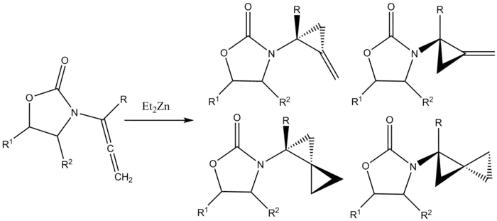 A Furukawa-modified Simmons–Smith reaction cyclopropanates both double bonds in an allenamide to form amido-spiro [2.2] pentanes, featuring two cyclopropyl rings which share one carbon. The product of monocyclopropanation is also formed.[36][37]