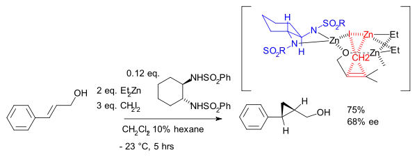 Although asymmetric cyclopropanation methods based on diazo compounds (see bisoxazoline ligand) exist since 1966, the asymmetric Simmons–Smith reaction was introduced in 1992 [14] with a reaction of cinnamyl alcohol with diethylzinc, diiodomethane and a chiral disulfonamide in dichloromethane: