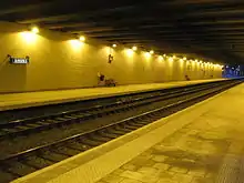 To differentiate between the two station parts, the north–south through platforms were given the name Simonis (Leopold II), while the east–west terminating platforms were known as Simonis (Elisabeth). However, this did not improve the clarity of passenger information and thus, on 3 November 2013, Simonis (Leopold II) was reverted to simply Simonis, while Simonis (Elisabeth) became Elisabeth.[2][3] The adjacent bus, tram and railway stops have not been renamed, and are all still known as Simonis.