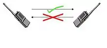 For example, in TV and radio broadcasting, information flows only from the transmitter site to multiple receivers. A pair of walkie-talkie two-way radios provide a simplex circuit in the ITU sense; only one party at a time can talk, while the other listens until it can hear an opportunity to transmit. The transmission medium (the radio signal over the air) can carry information in only one direction.