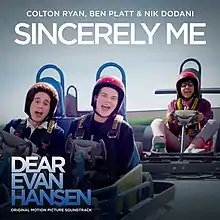 "Sincerely, Me" was featured in Universal Pictures' 2021 film adaptation of the musical, starring Ben Platt, who reprised his performance in the titular role and was sung by him, Colton Ryan as Connor Murphy and Nik Dodani as Jared Kalwani (changed from Kleinman to accommodate Dodani's casting). The film, which premiered at the 2021 Toronto International Film Festival on September 9, 2021,[8] followed by a theatrical release on September 24, 2021, is directed by Stephen Chbosky from a screenplay by Levenson, who also serves as an executive producer with Michael Bederman, Pasek & Paul and the show's lead producer Stacey Mindich. Ben's father Marc Platt and Adam Siegel serve as producers.[9]