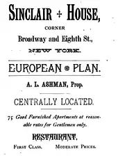 Amaziah L. Ashman was proprietor of Sinclair House from 1863 until his death in 1902. In the first part of that period, he was a partner with James Morton in the venture, and later became sole owner.[8] Ashman was a native of Livingston County, New York and the director of Astor Place Bank.[9][10] His New York Times obituary described him as "one of the best-known hotel keepers in this country."[10]