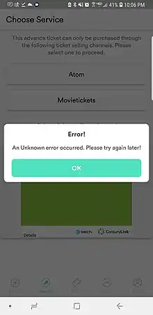 In March 2019, Sinemia users began reporting problems with the company's app. Complaints ranged from the inability to purchase tickets due to error messages within the app, to not being able to check in via the app when seeing the movie as required under the company's terms of service. One common error message was termed the "Error OK" message due to the placement of a single "Error" word and the OK button beneath it (see photo). Many reported this problem had been happening for days and weeks, and that the response to customer service inquiries was either slow, unhelpful, or non-existent, with some cancelling their subscriptions due to the lack of assistance with the app's problems.[29] The app currently holds a 2.5/5 rating on Google Play[30] and 1.1/5 on iTunes.[31]