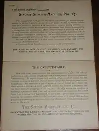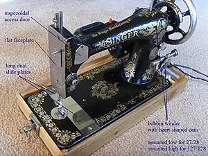 The Singer Model 27 and later model 127 were a series of lockstitch sewing machines produced by the Singer Manufacturing Company from the 1880s to the 1960s. (The 27 and the 127 were full-size versions of the Singer 28 and later model 128 which were three-quarter size). They were Singer's first sewing machines to make use of "vibrating shuttle" technology. Millions were produced.[lower-alpha 1] They are all steel and cast iron, and were built before the advent of planned obsolescence, and so they were designed to be repaired rather than replaced.[lower-alpha 2] Consequently many remain today, some in collections and others still in service. In company literature they were called "the woman's faithful friend the world over".[2]