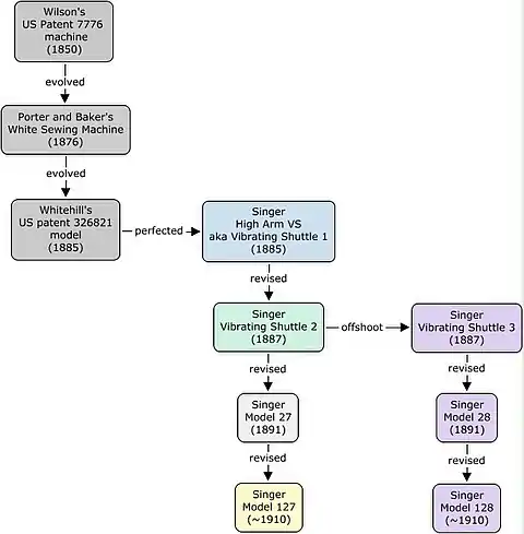 The design of the model 27 series began with Allen B. Wilson, who invented the vibrating shuttle in 1850 and sold machines built around it. Two decades later, when the patents had expired and the Sewing Machine Combination patent pool had dispersed, White Sewing Machine Company employees D'Arcy Porter and George W. Baker built a new machine that made successful use of it. The "White Sewing Machine", as it was first named, entered production in 1876. It was popular in its time, and some of them remain.[lower-alpha 4]