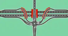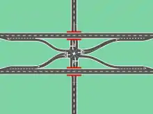 A three-level SPUI is similar to a standard SPUI but includes an additional grade separation allowing for free-flowing through traffic on the crossroad;[16][17] such through traffic thus bypasses the signalized intersection. The remaining intersection, free of the crossroad's through traffic, uses a two-phase traffic signal for handling the left turns in pairs, similar to the traffic flow at an inverted SPUI.