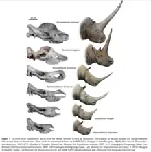 Early elasmotheriine genera of the line leading to Elasmotherium, have a dolichocephalic skull supporting a horn growing on their nose, just like any other Rhinocerotid, however, Elasmotherium was the sole member of Elasmotheriinae that had a brachycephalic skull and supported a horn on its forehead instead.[5] A transition between this state of nose-horned to forehead-horned elasmotheriines remained missing until 2012, when the first cranial remains of Sinotherium lagrelii, (specimen IVPP V 18539, a partial skull housed at the Institute of Vertebrate Paleontology and Paleoanthropology, Chinese Academy of Sciences in Beijing) was described, demonstrating a very important transition from nose-horned elasmotheriines like Ningxiatherium to forehead-horned elasmotheriines like Elasmotherium.[5]